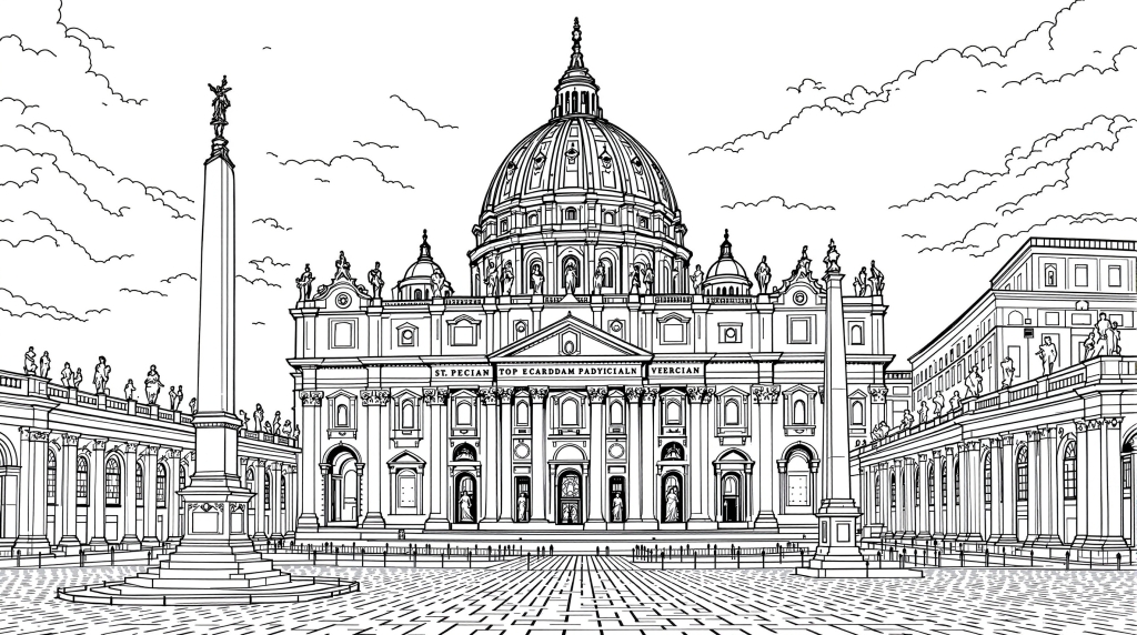 Esta magnífica página de colorir arquitetônica apresenta a icônica Basílica de São Pedro em Roma sob um céu noturno dramático cheio de padrões de nuvens rodopiantes e uma lua cheia... Leia mais
